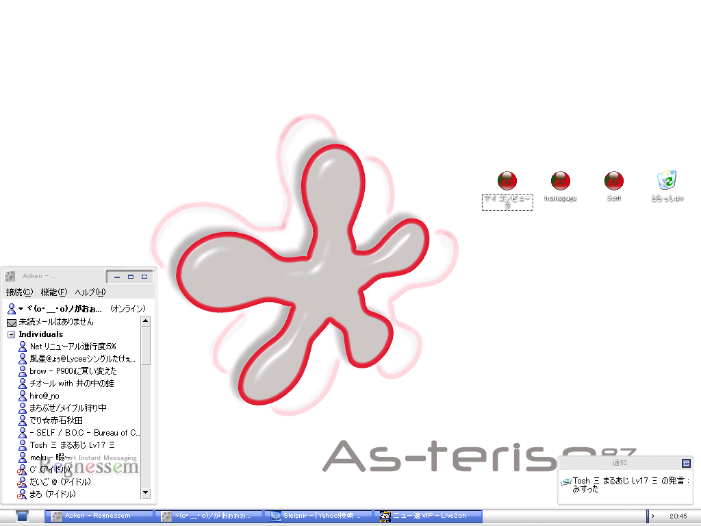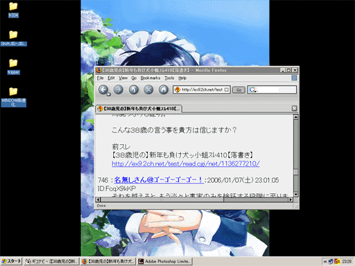 | D | [kooge963.gif] | 漏れのデスクトップ | 51kB | 2006/01/07(Sat)23:30 | _0-1.GIF